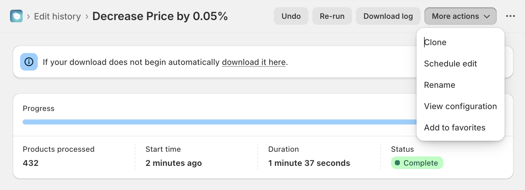 You can click buttons to Undo, Re-run or Download log of all edits. You can also click the 'More actions' dropdown for other actions: