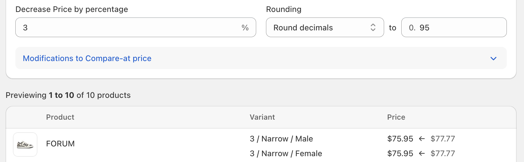 If you wish to round just the decimal of existing prices without making any other change to the whole number, you can set the percentage change to zero and then select your preferred rounding option. This will apply the rounding without altering the original price.