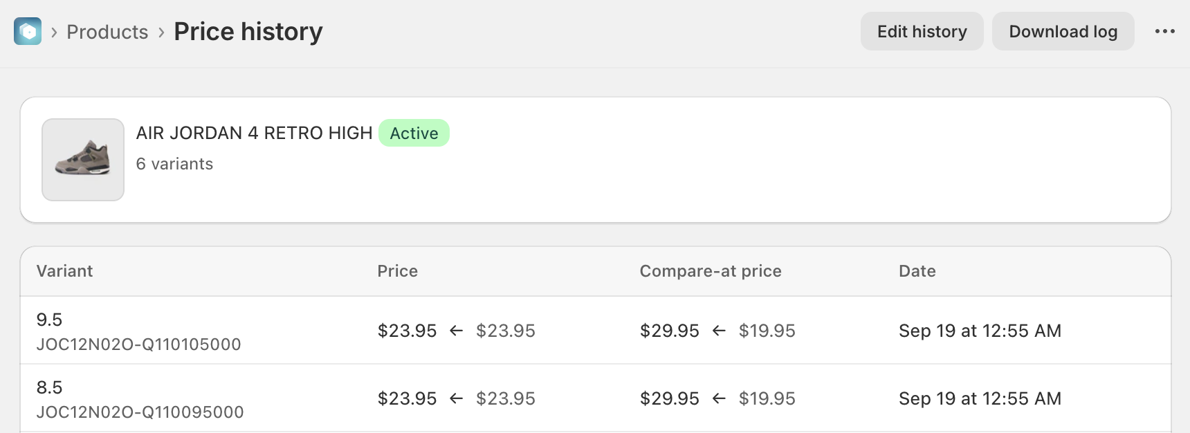 Ablestar Bulk Product Editor retains and tracks price history for your products. This gives you the ability to view all price changes, from the Shopify product level.