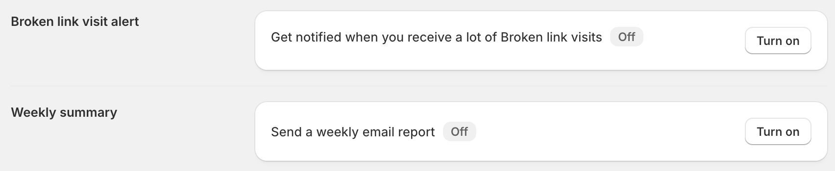 You can choose to turn on this notification to reported in the case of sudden spikes in broken link visits. Specify the email user that should receive alert, the timeframe to consider alerts and the threshold or minimum number of links that should trigger a report.