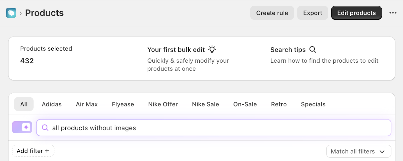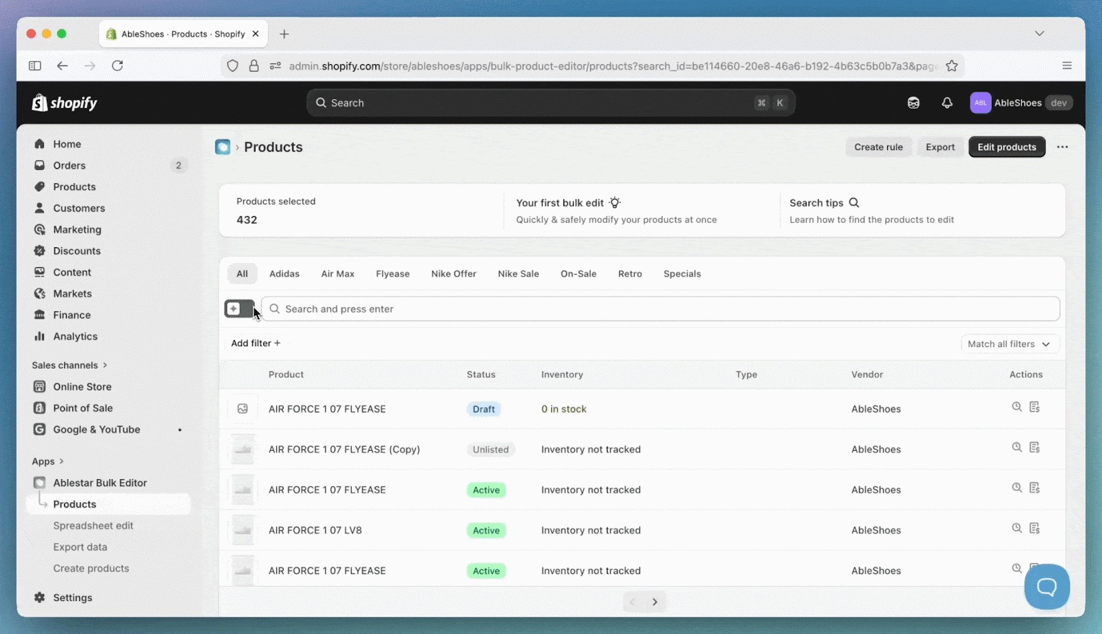 We now have limited access to a search assistant that can help you with filtering and searching products in Ablestar Bulk Product Editor. This robust functionality can search through exact tag names, vendor names, product types, and collections.